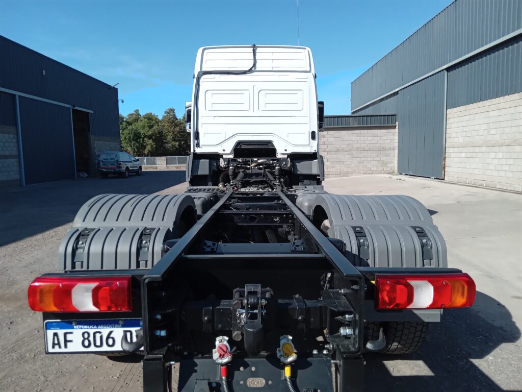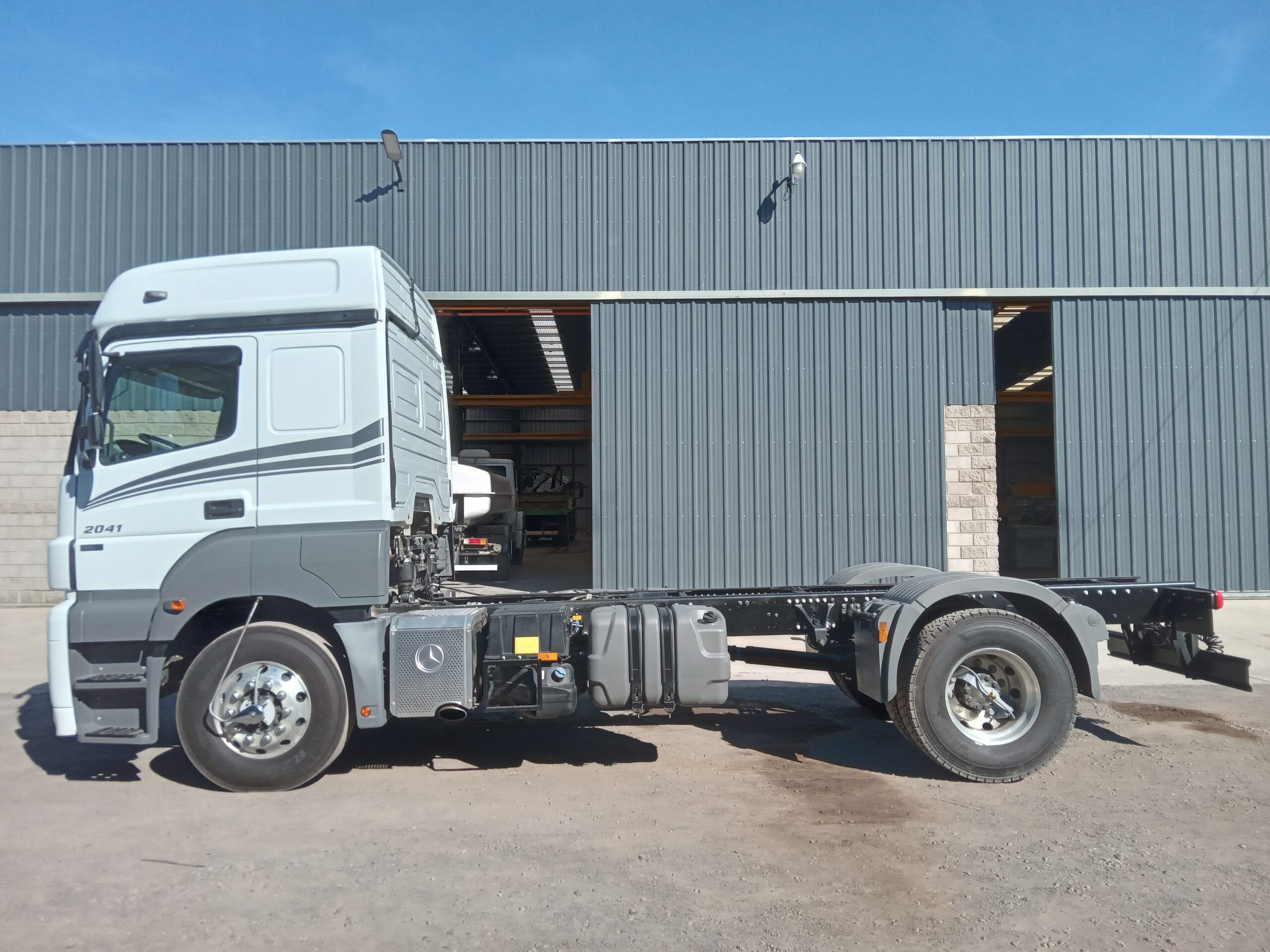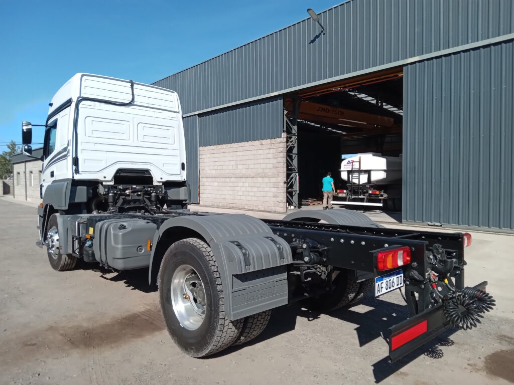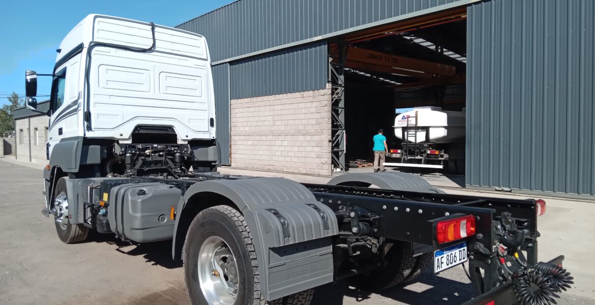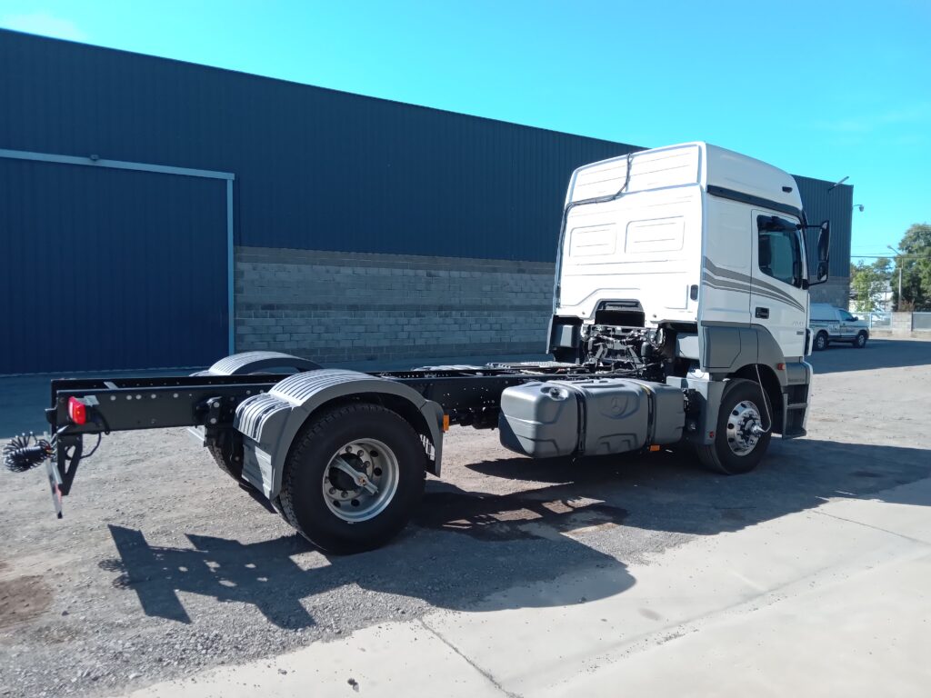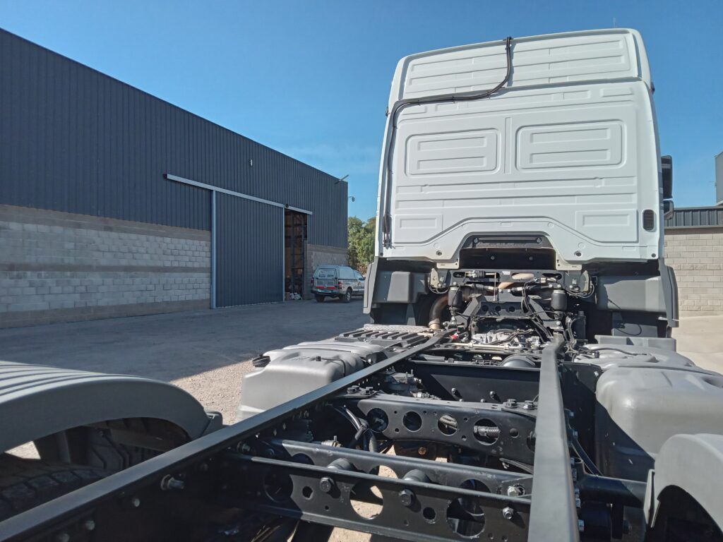 Trabajo de Modificación de distancia entre ejes (Cambio de paso), Alargue de chasis e Instalación de enganche trasero en camión Mercedes Benz Axor 2041.