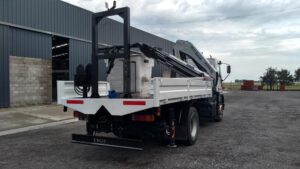 La hidrogrúa posee Estabilizadores delanteros y traseros hidráulicos, Preparación hidráulica para hoyadora, Limitador de carga y Parada de emergencia.